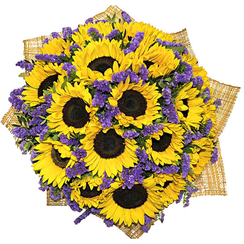 Букет состоит из 25 подсолнухов, 10 веток статицы, зелень, красивая упаковка, атласная лента.