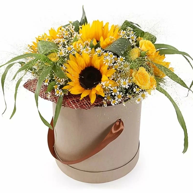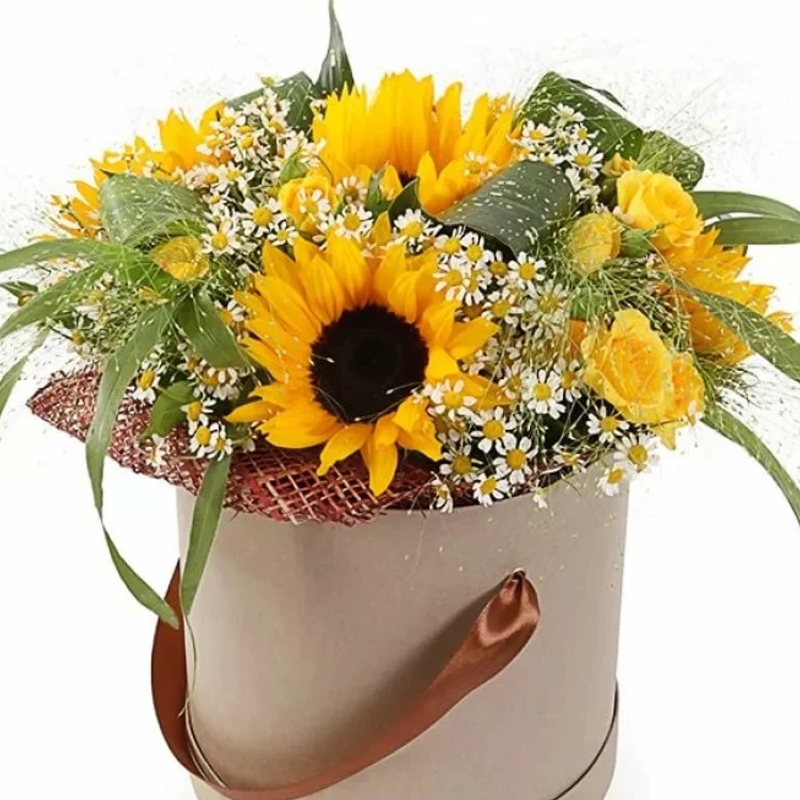Букет из подсолнухов и роз в коробке