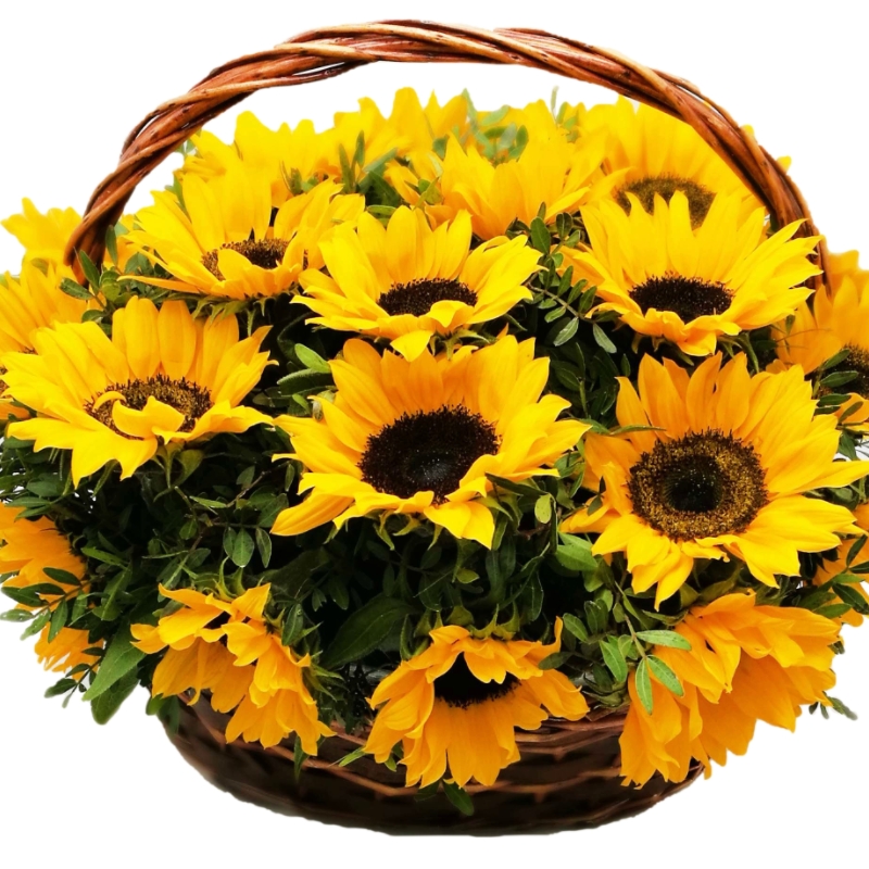 Букет состоит из 25 подсолнухов, зелень, корзина, оазис.