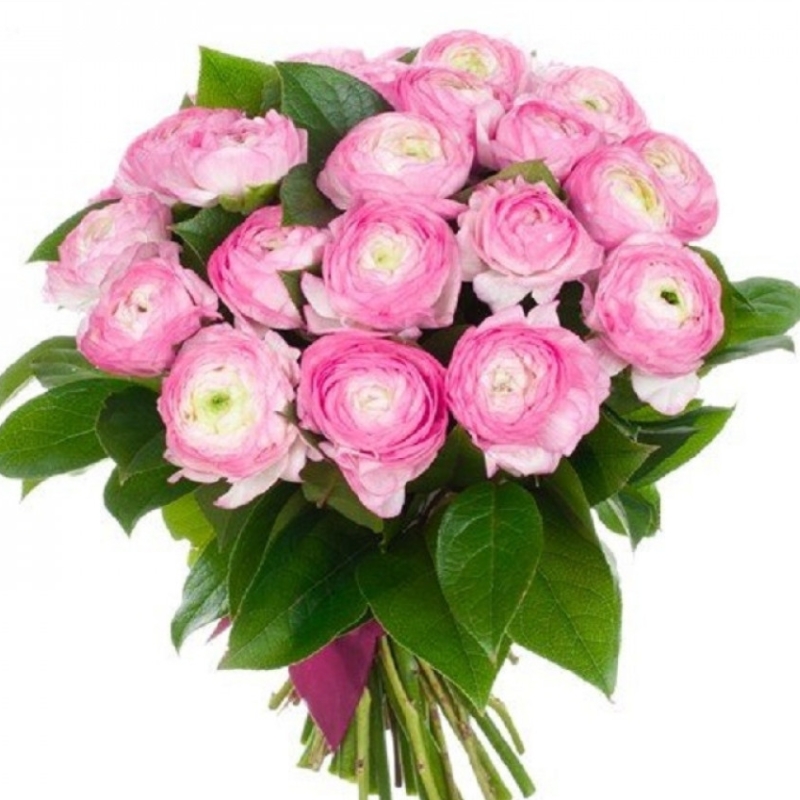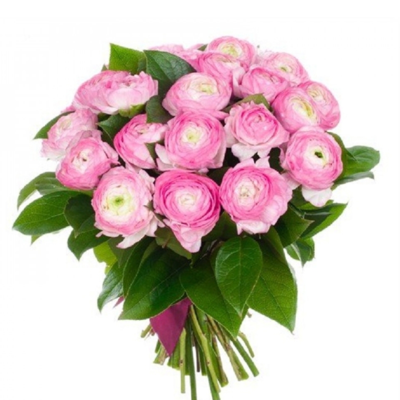 Букет состоит из 21 розовый ранункулюс, прозрачная упаковка, атласная лента.
