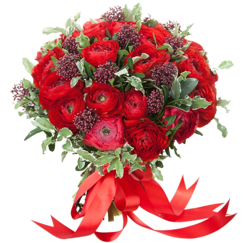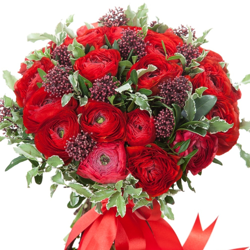 Букет состоит из 25 красных ранункулюсов, 10 скиммия, питтоспорум, прозрачная упаковка, атласная лента.