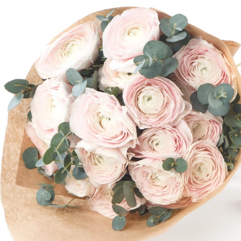 Букет состоит из 19 розовых ранункулюсов, крафт, атласная лента.
