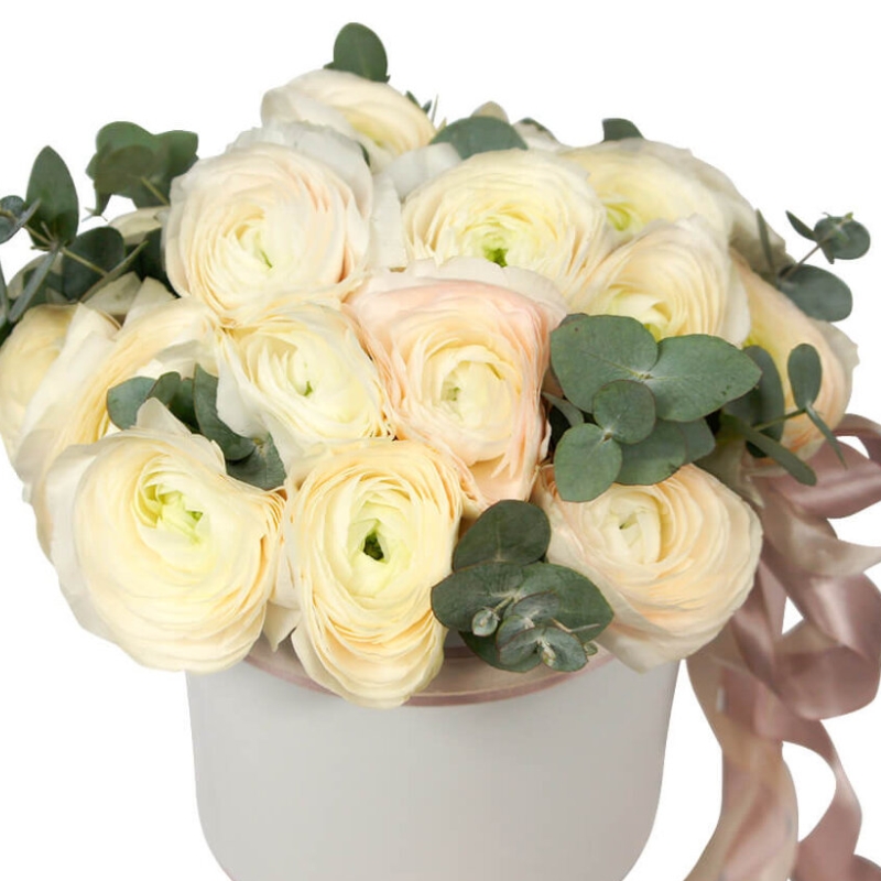 Букет состоит из 19 ранункулюсов, эвкалипт, коробка, оазис, атласная лента.