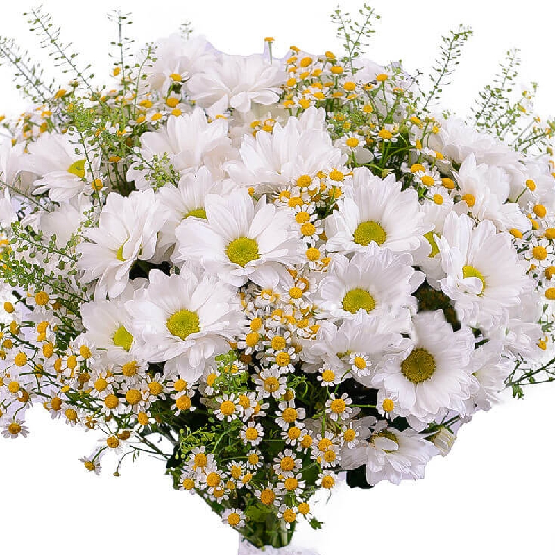 Букет состоит из 7 веток хризантемы, 12 веток танацетума, прозрачная упаковка, атласная лента.