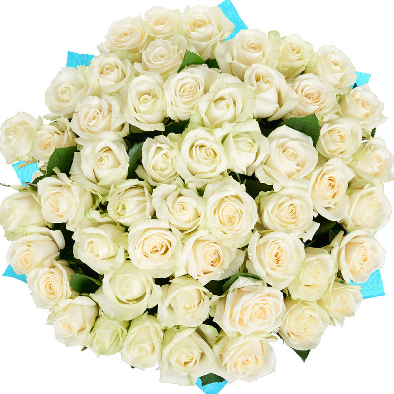Букет состоит из 55 белых роз, красивая упаковка, атласная лента.