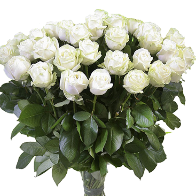 Букет состоит из 31 белая роза, прозрачная упаковка, атласная лента.