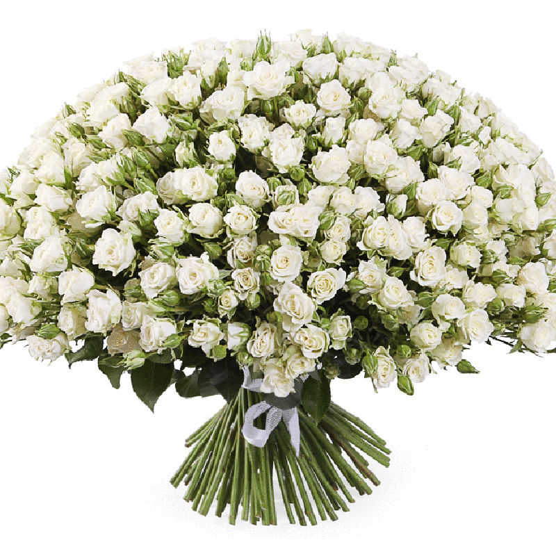 Букет состоит из 101 ветка белой кустовой розы, прозрачная упаковка, атласная лента.