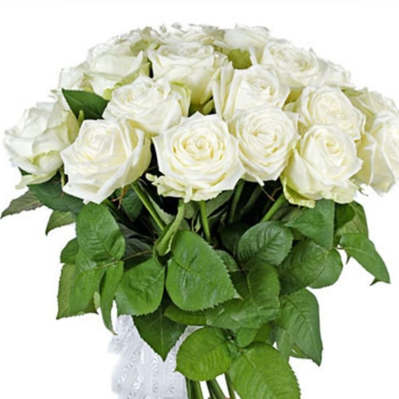 Букет состоит из 19 белых роз, прозрачная упаковка, атласная лента.