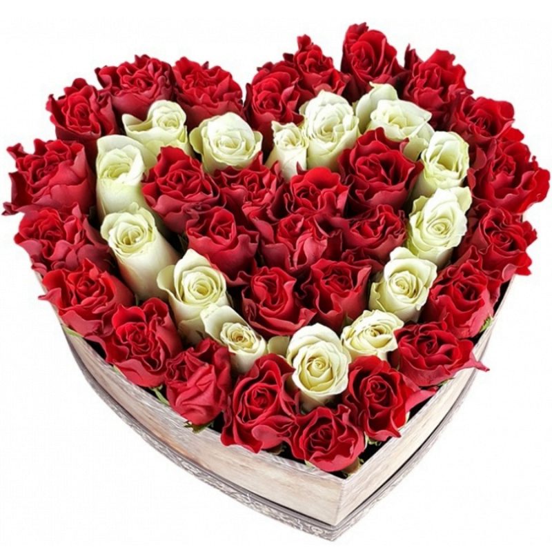 Композиция "Сердце" из 45 красных и белых роз в коробке