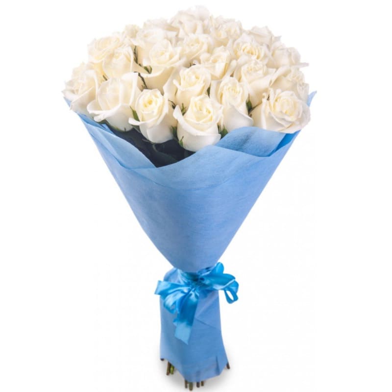 Букет состоит из 25 белых роз, красивая упаковка, атласная лента.