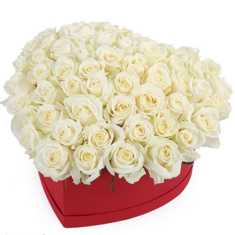 51 белая роза, коробка в виде сердца.