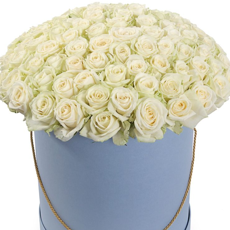 Букет состоит из 101 белая роза, голубая или синяя коробка.