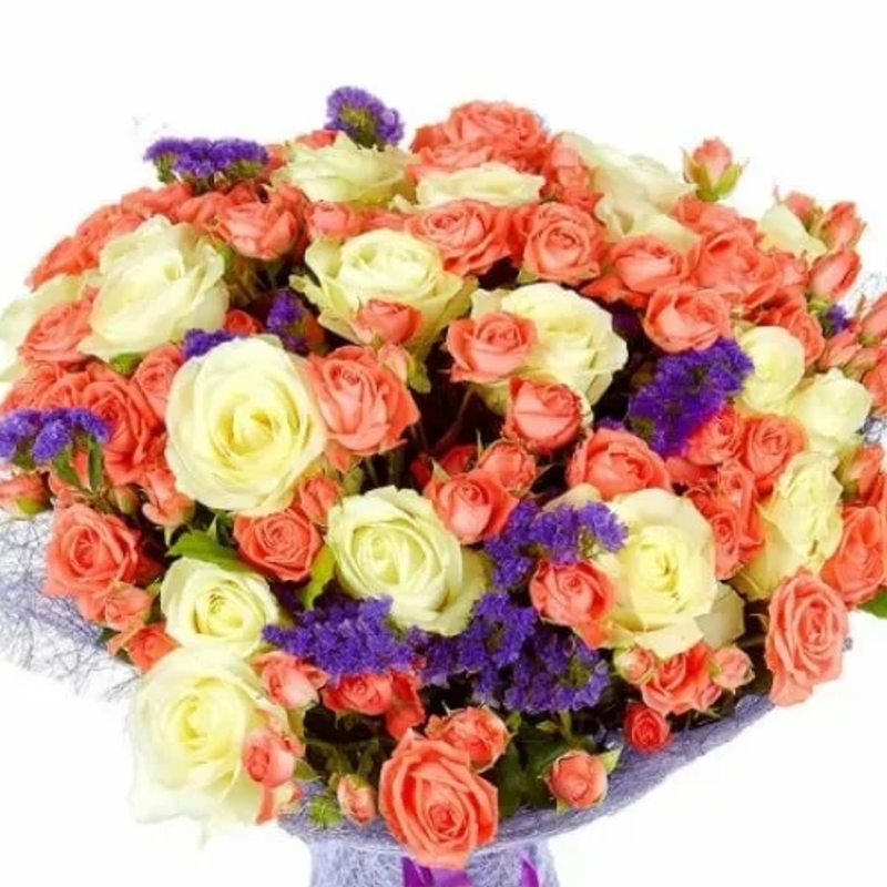 Букет состоит из 19 белых роз, 10 веток коралловых роз, 5 статица, упаковка, лента.