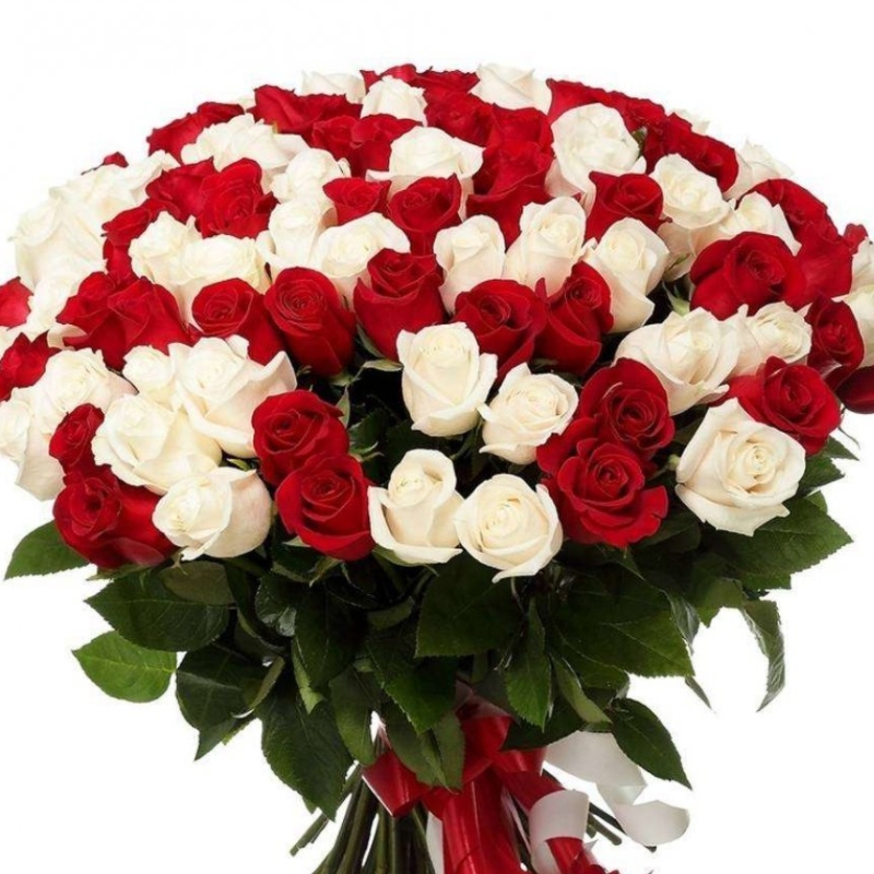 Букет состоит из 51 белая роза, 50 красных роз, прозрачная упаковка, белая и красная лента.