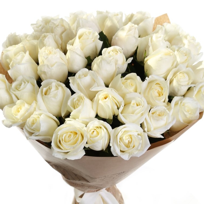 Букет состоит из 51 белая роза, крафт, атласная лента.