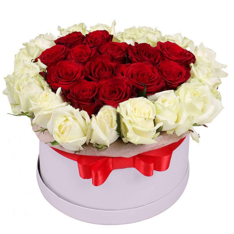 31 красная и белая роза, коробка, атласная лента.