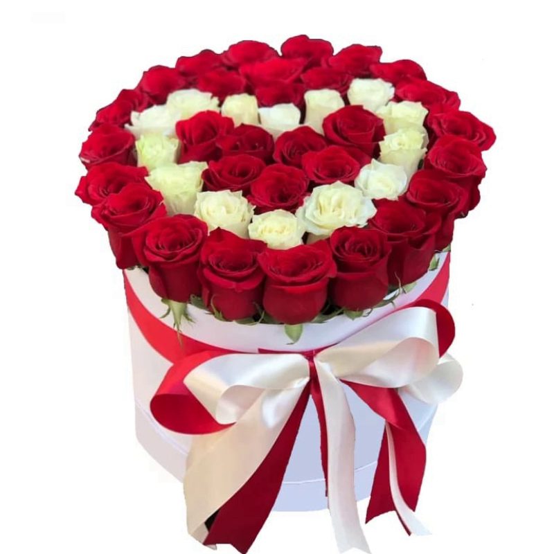 Сердце из 45 красных и белых роз в коробке