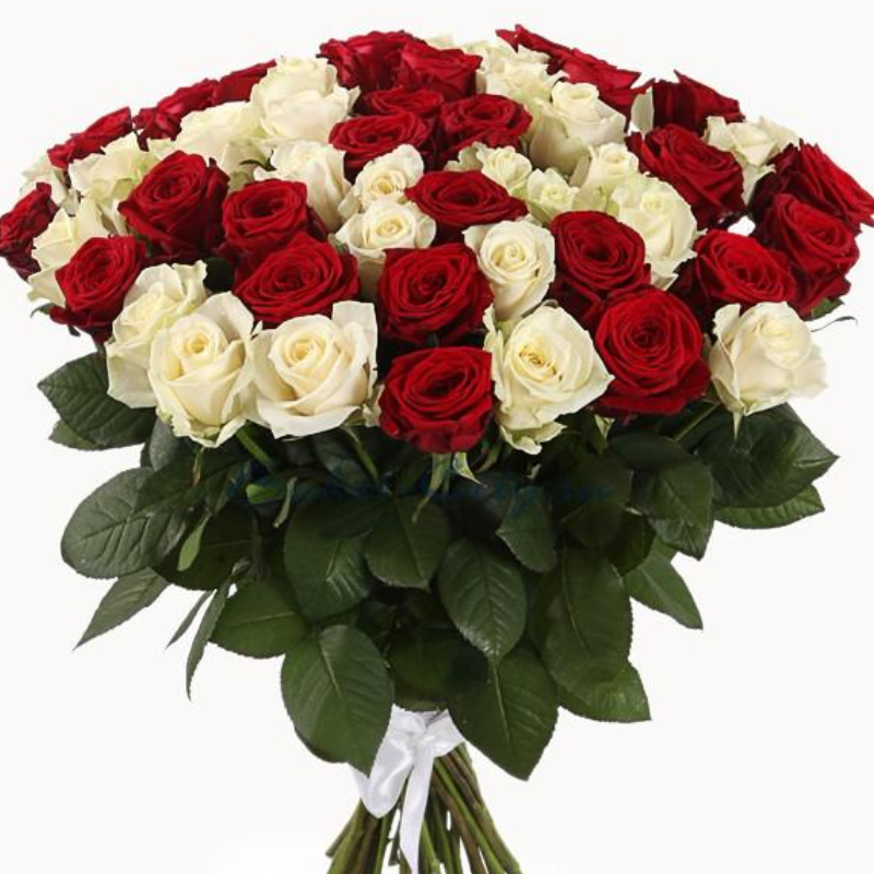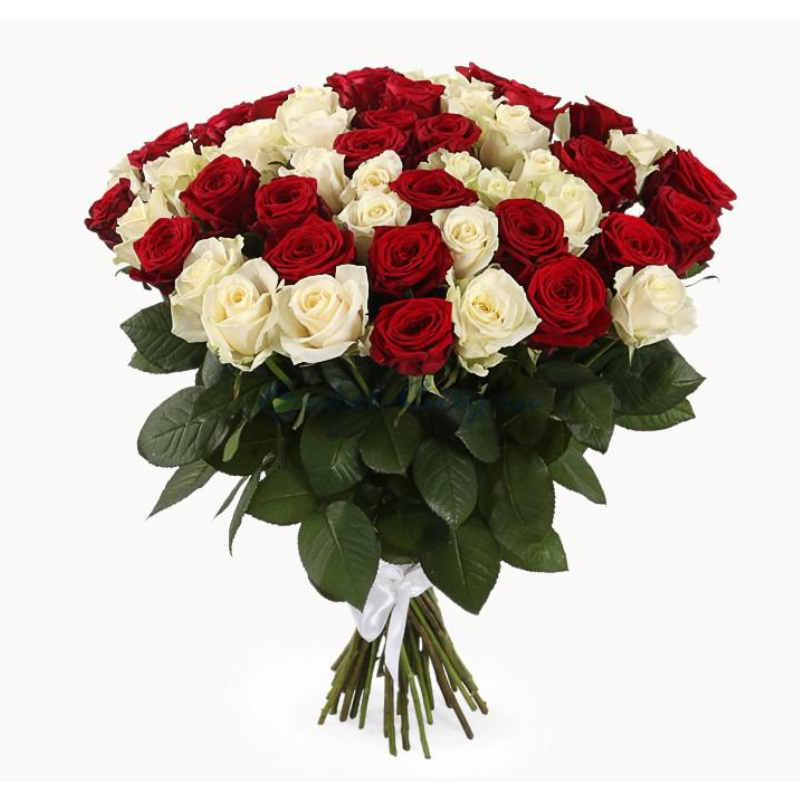 Букет состоит из 51 красная и белая роза, прозрачная упаковка, атласная лента.