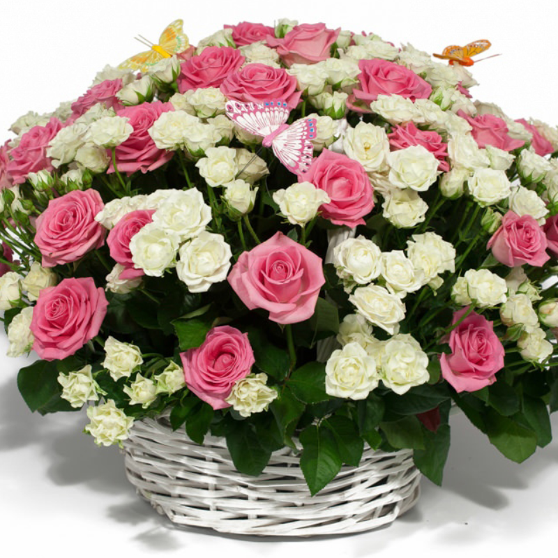 Букет состоит из 29 розовых роз, 26 белых кустовых роз, корзина.