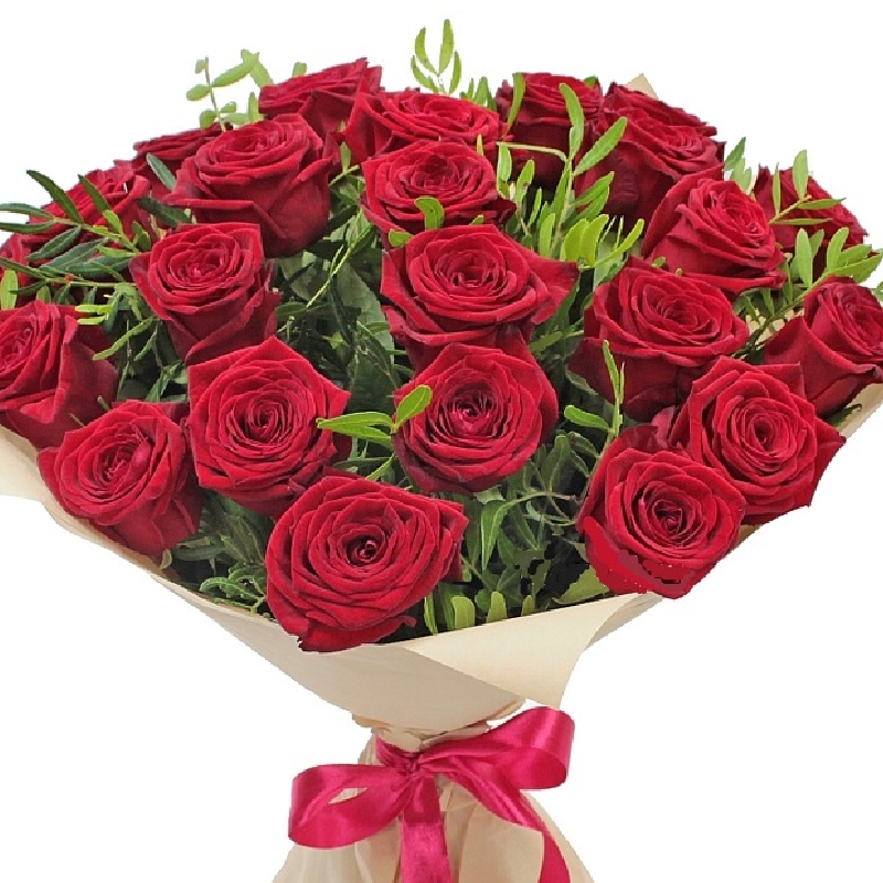 Букет состоит из 25 роз, писташ, крафт, атласная лента.