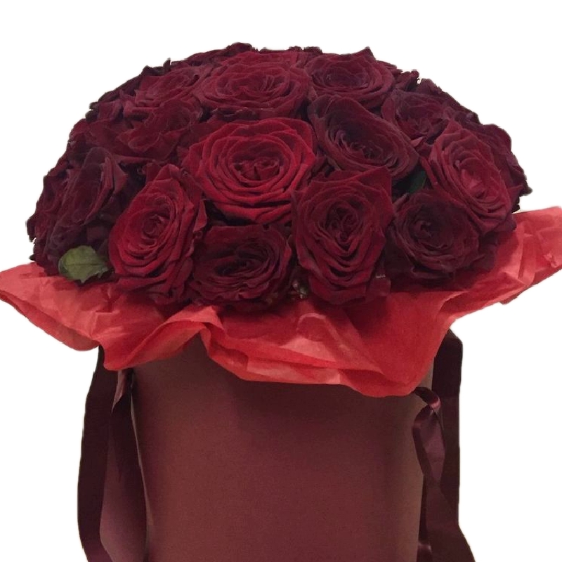 Букет состоит из 25 бордовых роз, коробка, бумага тишью, оазис.