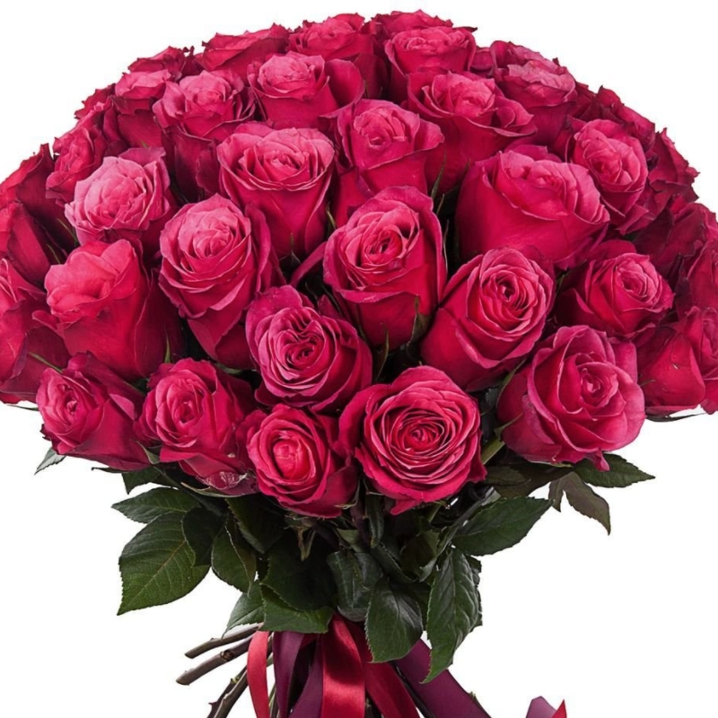 Букет состоит из 45 малиновых роз, прозрачная упаковка, атласная лента.