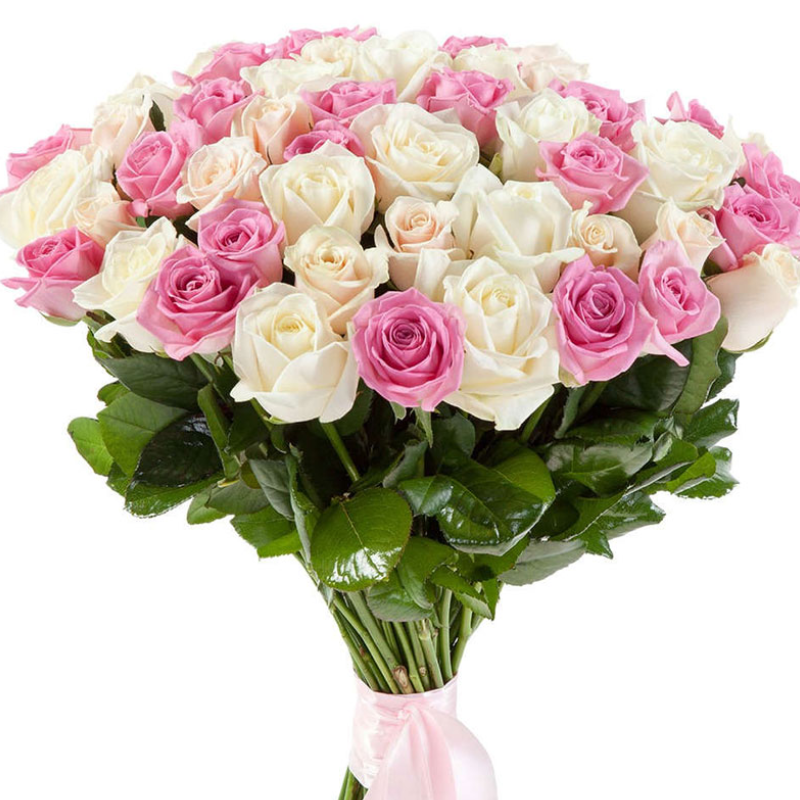 Букет состоит из 25 белых роз, 26 розовых роз, прозрачная упаковка, атласная лента.