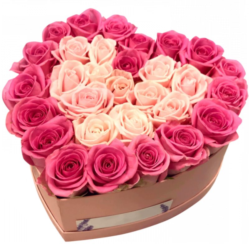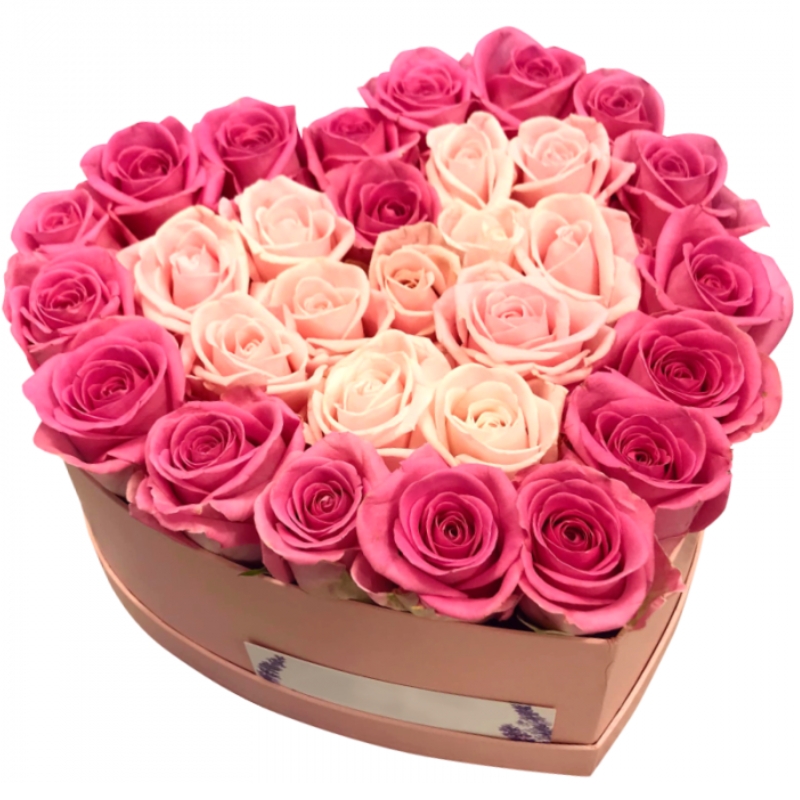 31 розовая и кремовая роза, коробка в виде сердца.