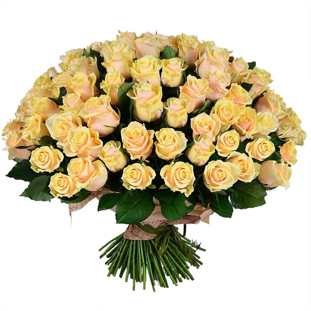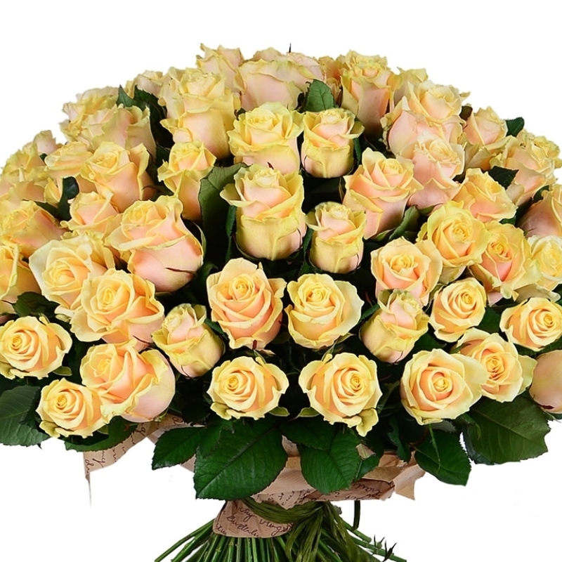 Букет состоит из 101 кремовая роза, прозрачная упаковка, атласная лента.