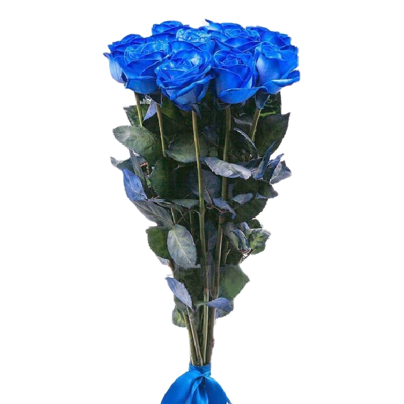 Букет состоит из 11 синих роз, прозрачная упаковка, атласная лента.