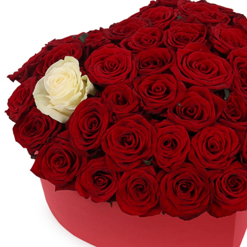 44 красные розы, 1 белая роза, коробка в виде сердца.