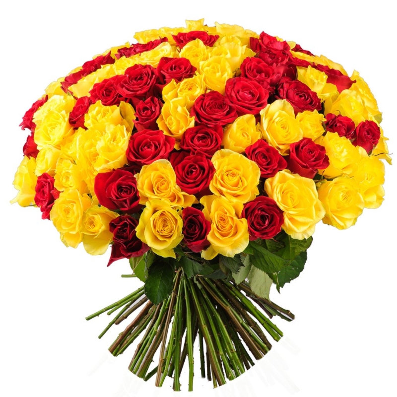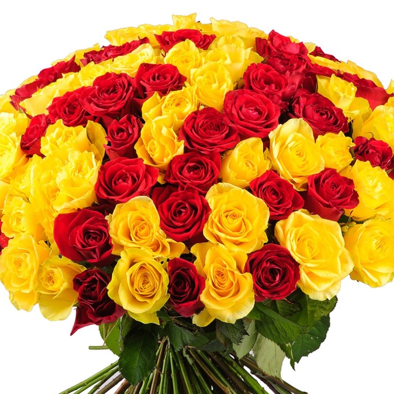 Букет состоит из 51 красная роза, 50 желтых роз, прозрачная упаковка, атласная лента.
