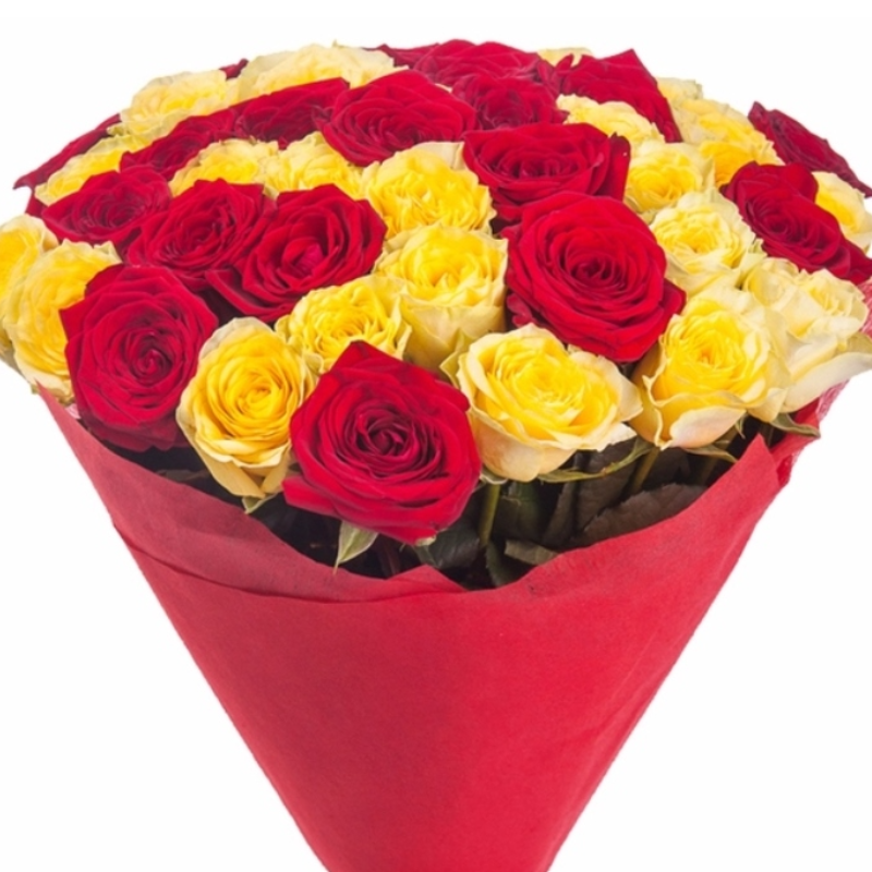 Букет состоит из 11 красных роз, 10 желтых роз, красивая упаковка, атласная лента.