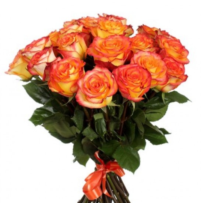 Букет состоит из 19 оранжевых роз, прозрачная упаковка, атласная лента.