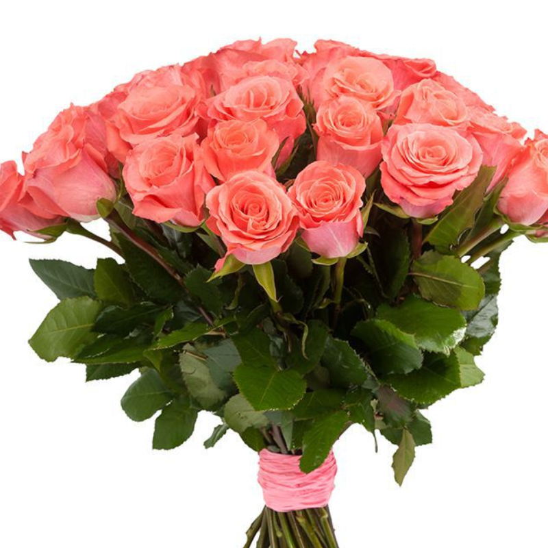 Букет состоит из 31 коралловая роза, прозрачная упаковка, атласная лента.