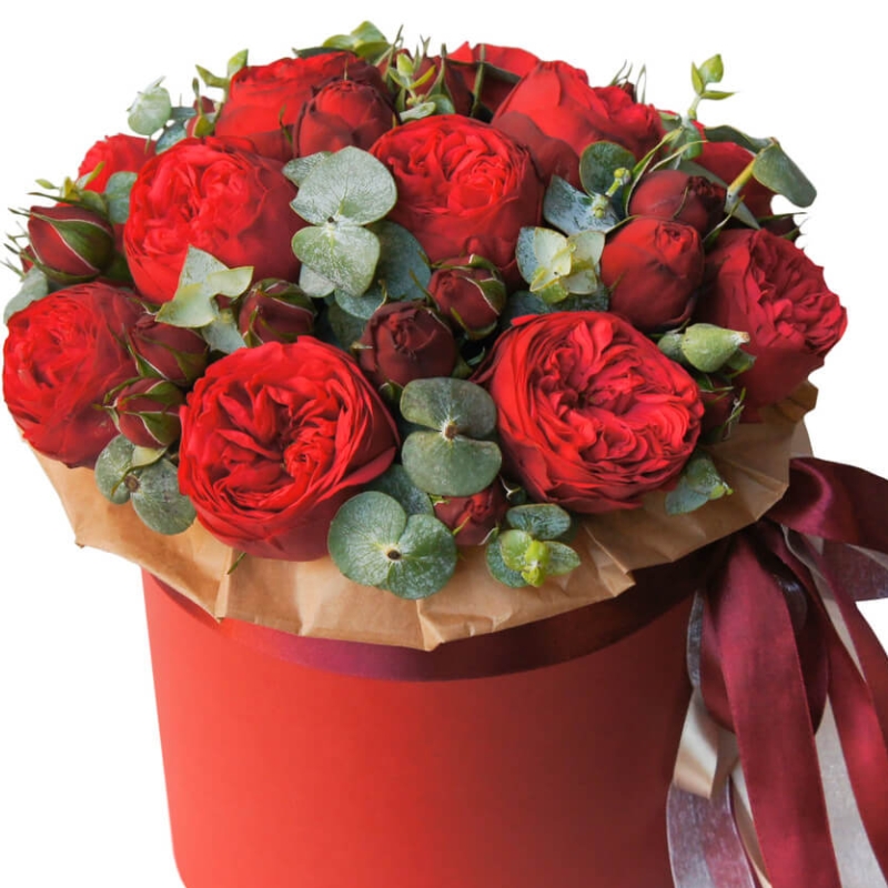 Букет состоит из 15 кустовых пионовидных роз, эвкалипт, коробка, оазис, лента.
