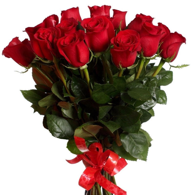 Букет состоит из 21 красная роза, прозрачная упаковка, атласная лента.
