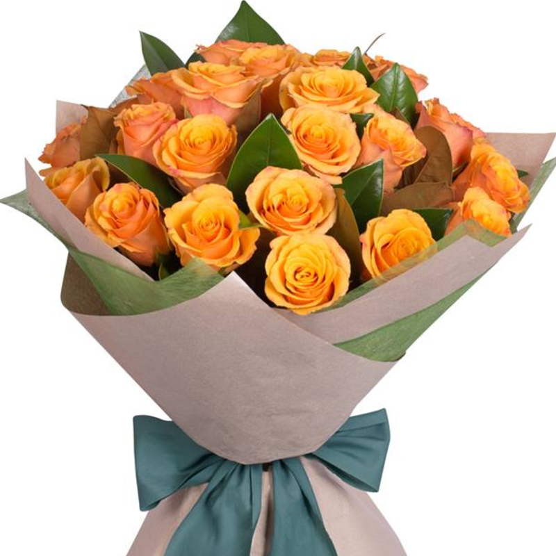 Букет состоит из 21 оранжевая роза, зелень, крафт, атласная лента.