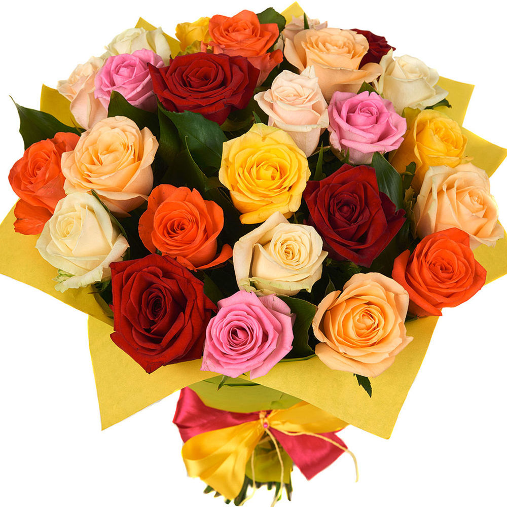 Букет состоит из MIX из 31 розовой / кремовой / желтой / красной и оранжевой розы, красивая упаковка, лента.