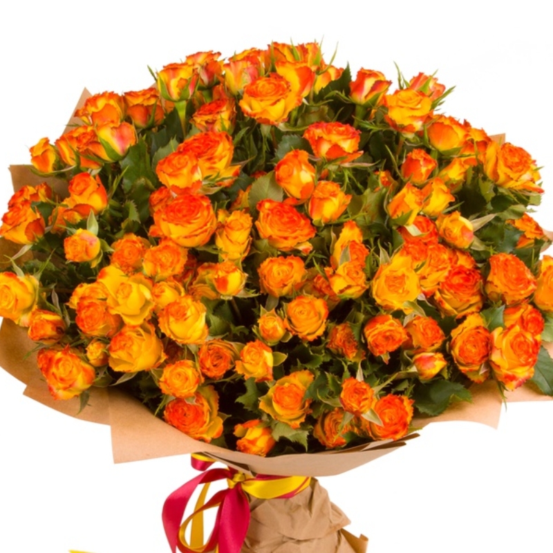 Букет состоит из 25 кустовых оранжевых роз, крафт, атласная лента.