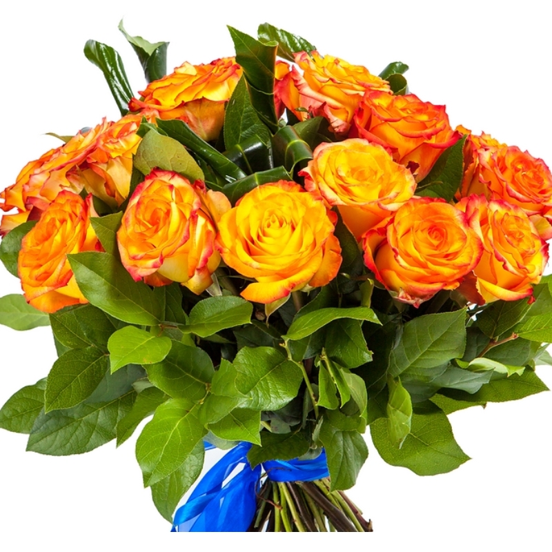 Букет состоит из 21 оранжевая роза, зелень, прозрачная упаковка, атласная лента.