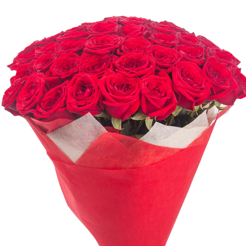 Букет состоит из 55 красных роз, красивая упаковка, атласная лента.