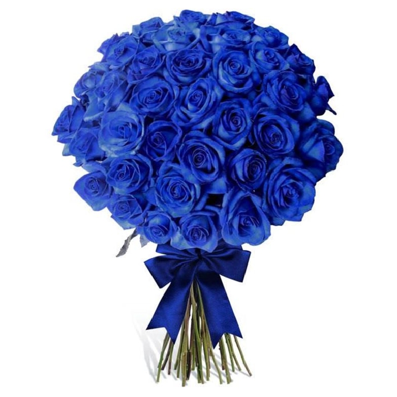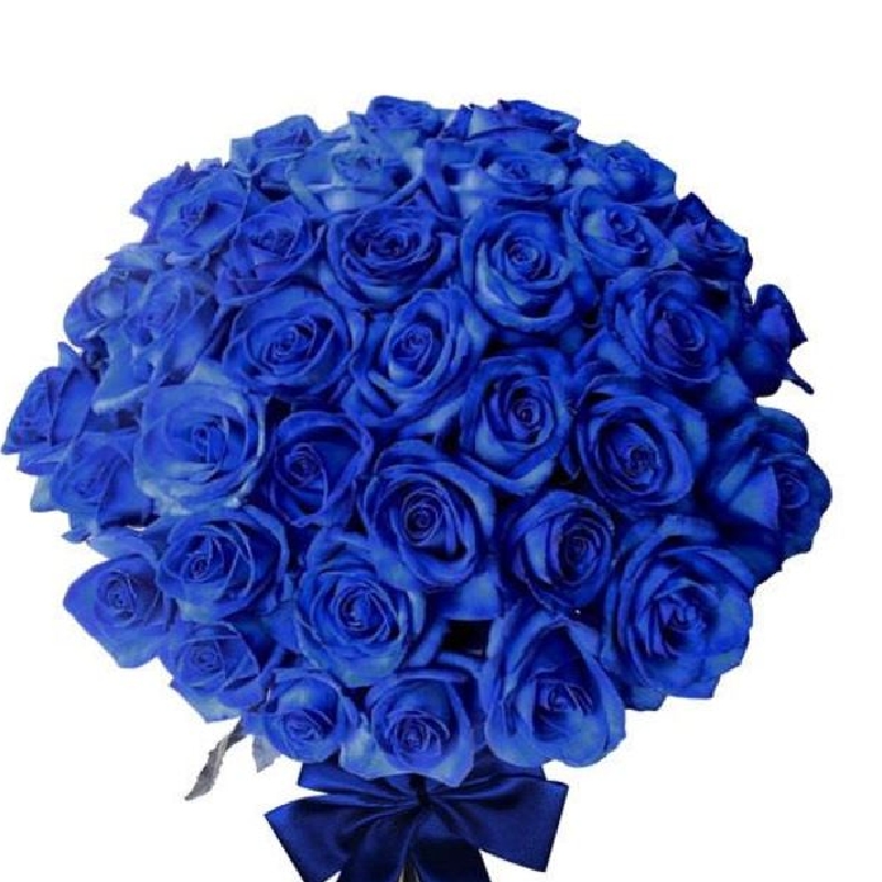 Букет состоит из 51 синяя роза, прозрачная упаковка, атласная лента.