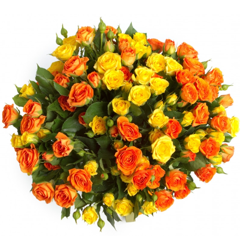 Букет состоит из 13 оранжевых кустовых роз, 8 желтых кустовых роз, прозрачная упаковка, атласная лента.