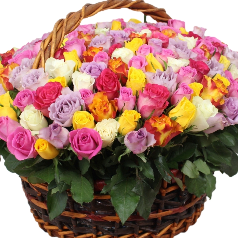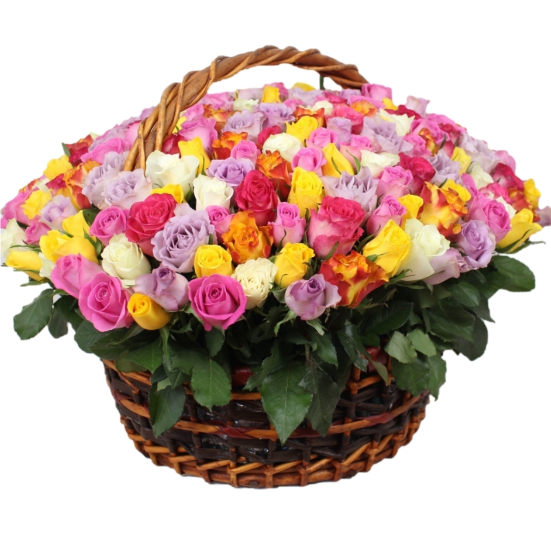 Букет состоит из MIX из 201 Кенийской розы, зелень, корзина, оазис.