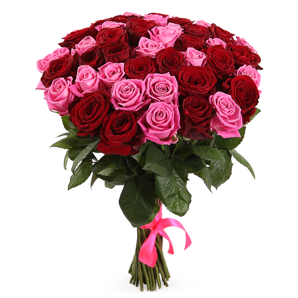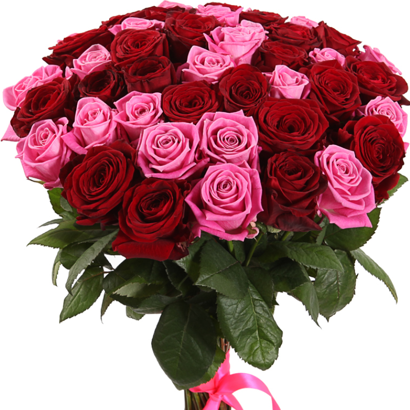 Букет состоит из 26 красных роз, 25 розовых роз, прозрачная упаковка, атласная лента.