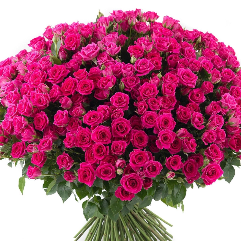 Букет состоит из 101 ветка малиновой кустовой розы, прозрачная упаковка, атласная лента.