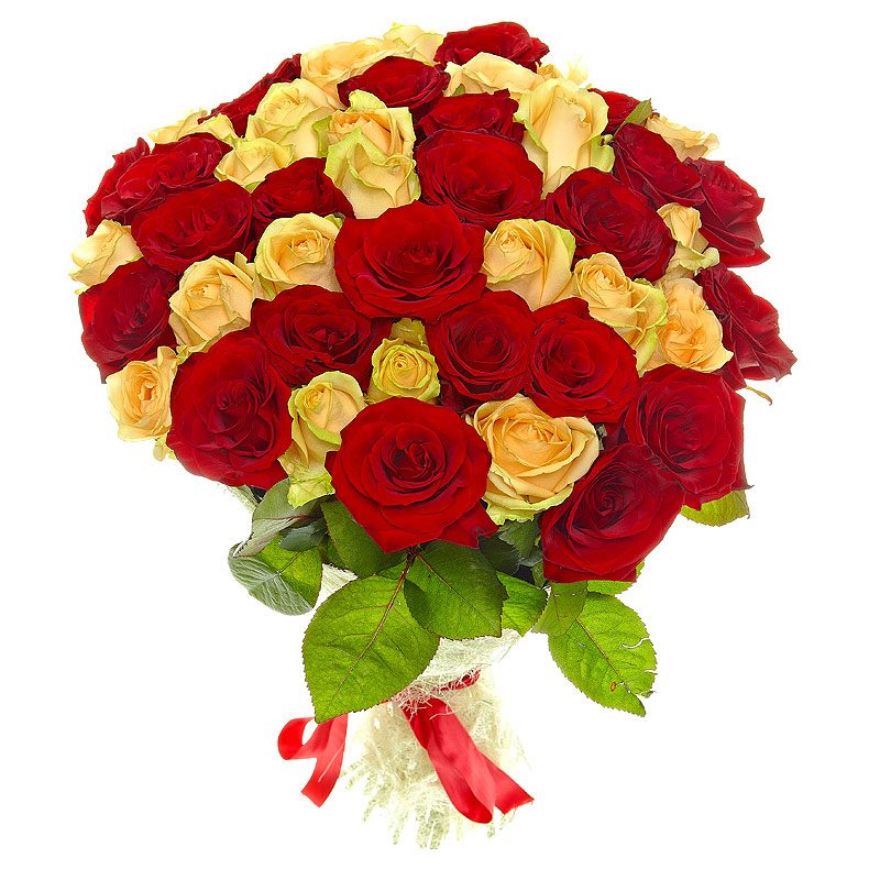Букет состоит из 23 красные розы, 22 кремовые розы, прозрачная упаковка, атласная лента.