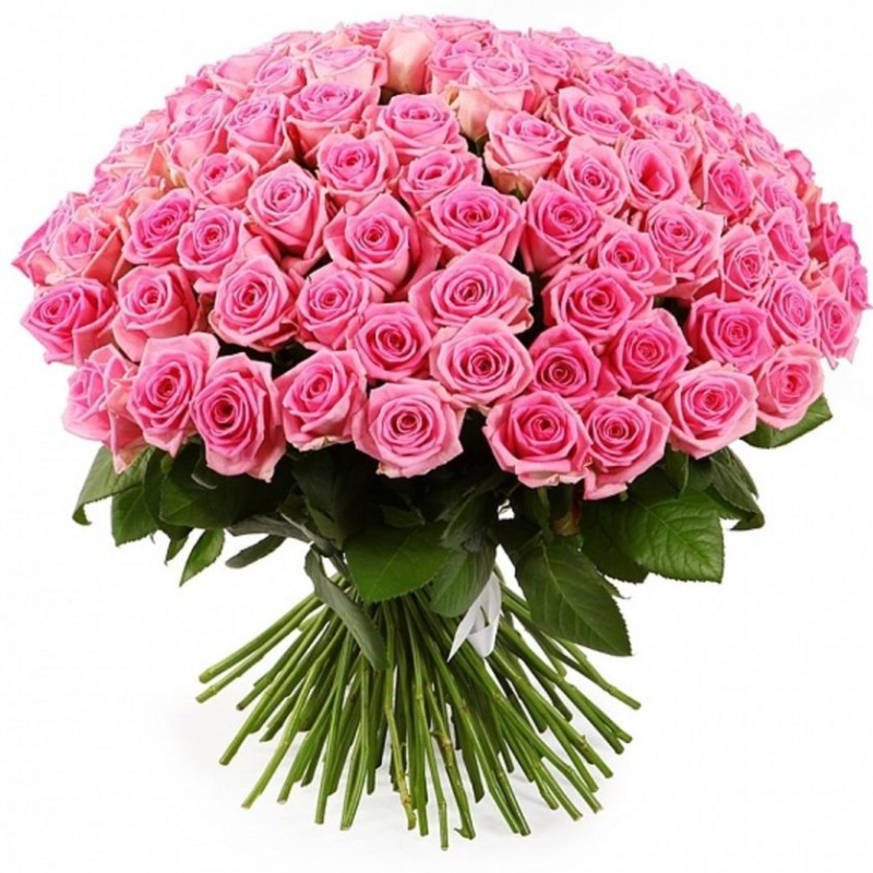 Букет состоит из 101 розовая роза, прозрачная упаковка, атласная лента.
