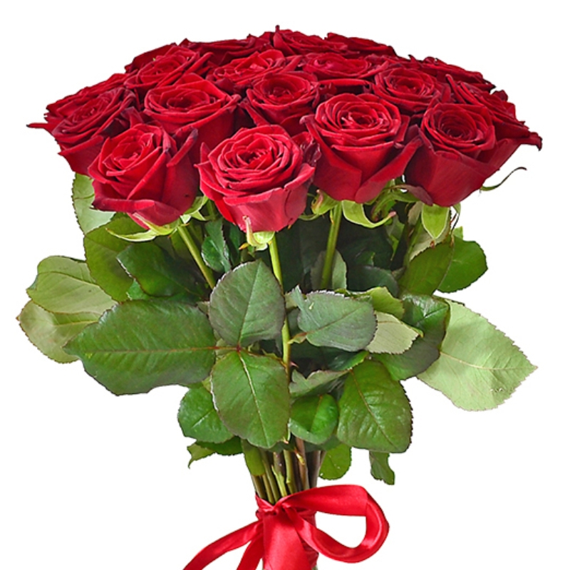 Букет состоит из 27 красных роз, прозрачная упаковка, красная лента.